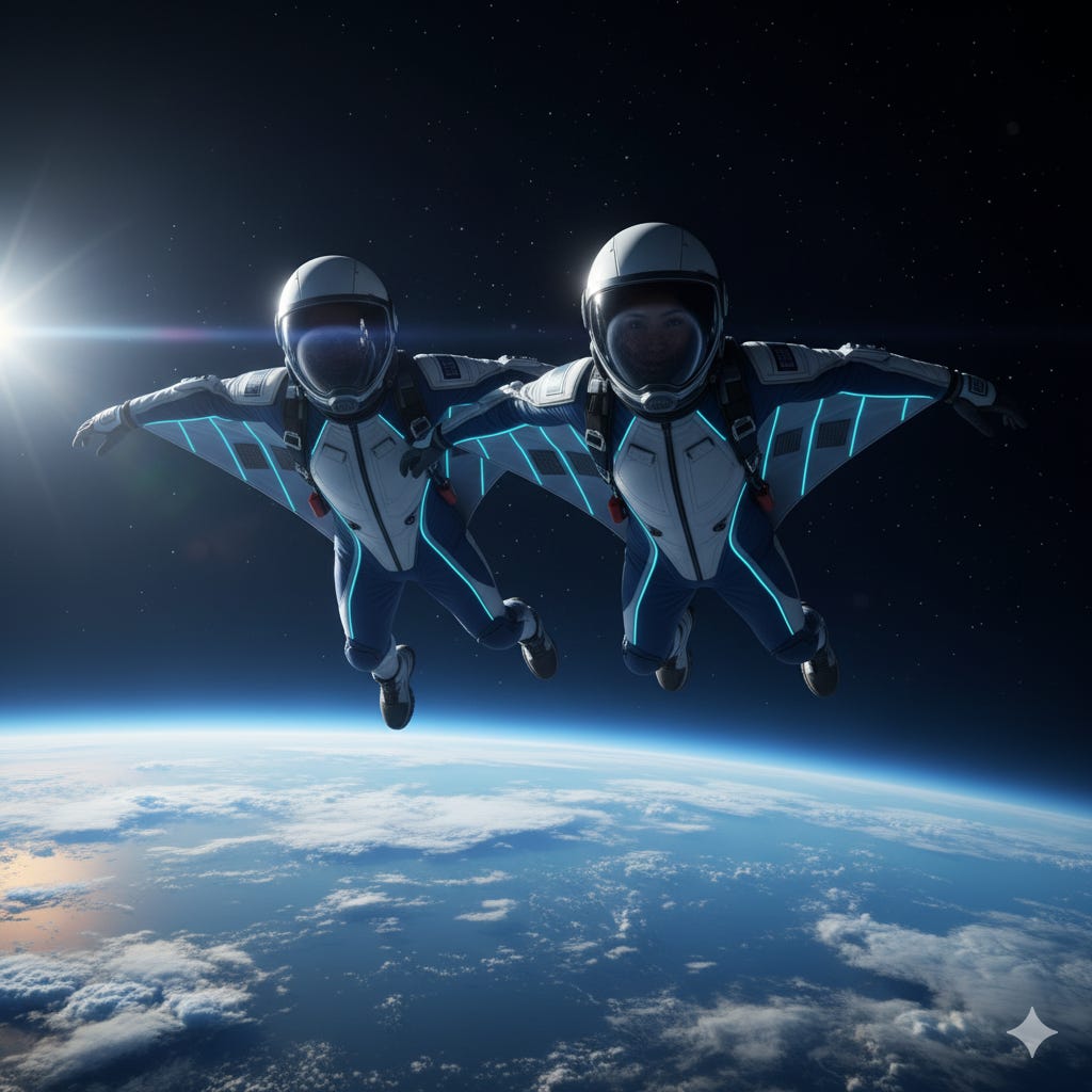 This was freedom. The air was crisp, almost painfully cold, but it made her feel alive. Their suits would regulate their core temperatures to stay within a nominal range. Over the radio they let out whoops of pure joy, sounds only the two of them could hear. The entire experience felt like they were dancing in the air, a metaphorical ballet through the sky.