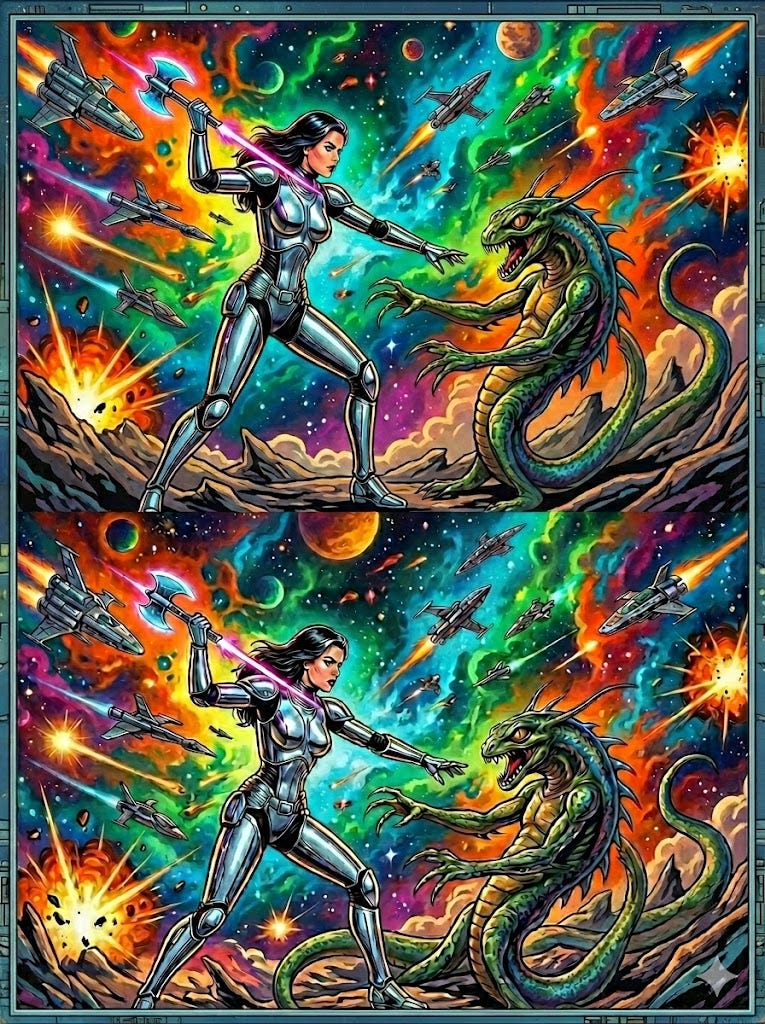 The screen was a hyper-saturated, jarring, visual assault. What looked like a chrome-armored knight held a glowing laser-axe against a creature that seemed to shift. It looked like a lizard one moment, then an insect the next, as if the algorithm couldn't quite decide.