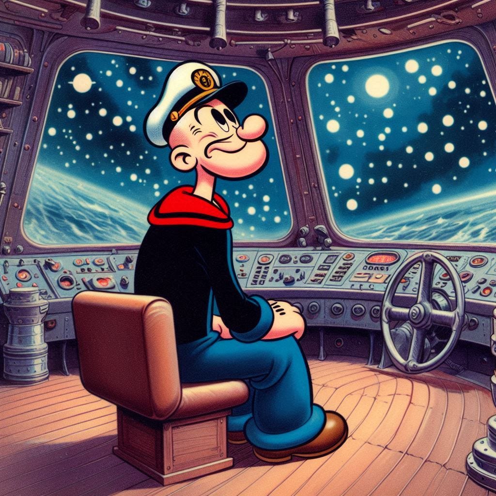 Now that Popeye has entered the public domain, I am writing a science-fiction story starring the sailor in an entirely new adventure. This story will be told over the next thirteen weeks exclusively available to members. If you’re not a member, now’s a great time to join.