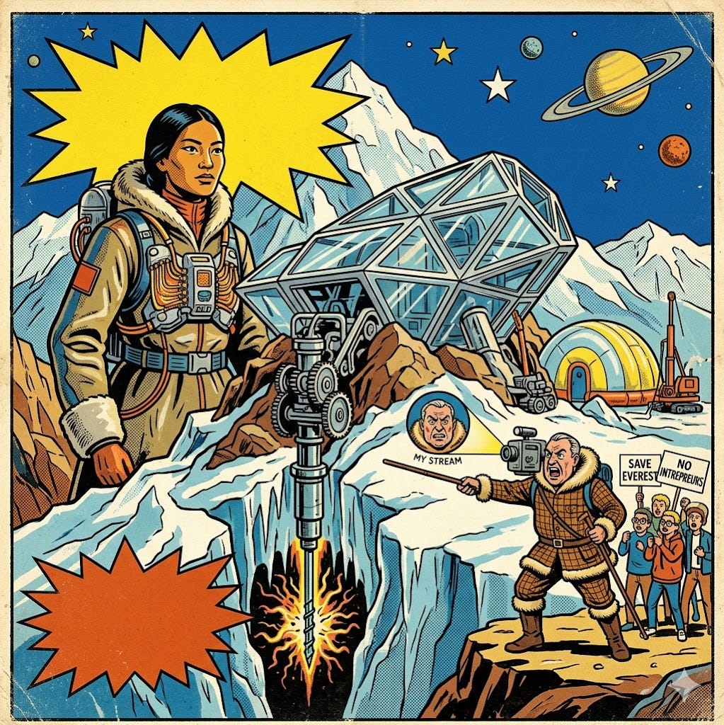 “Look at all this equipment. Heavy machinery? Here? What the hell do they think they’re drilling? This is desecrating the almighty Chomolungma! I always warn how big commercial developers defile our natural spaces under the lie of progress.”