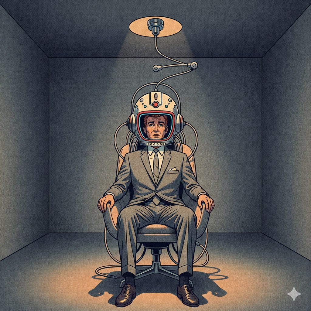 He looked at his seat. There was a vague feeling of being scared, of being restrained, but there wasn’t any rational reason for this. There weren’t any restraints. There wasn’t any reason to think he was in any danger, physical or otherwise. He thought that there was something pulled off his head, but he couldn’t see anything like that in the room. The room was just a peaceful, if clinical, lounge.