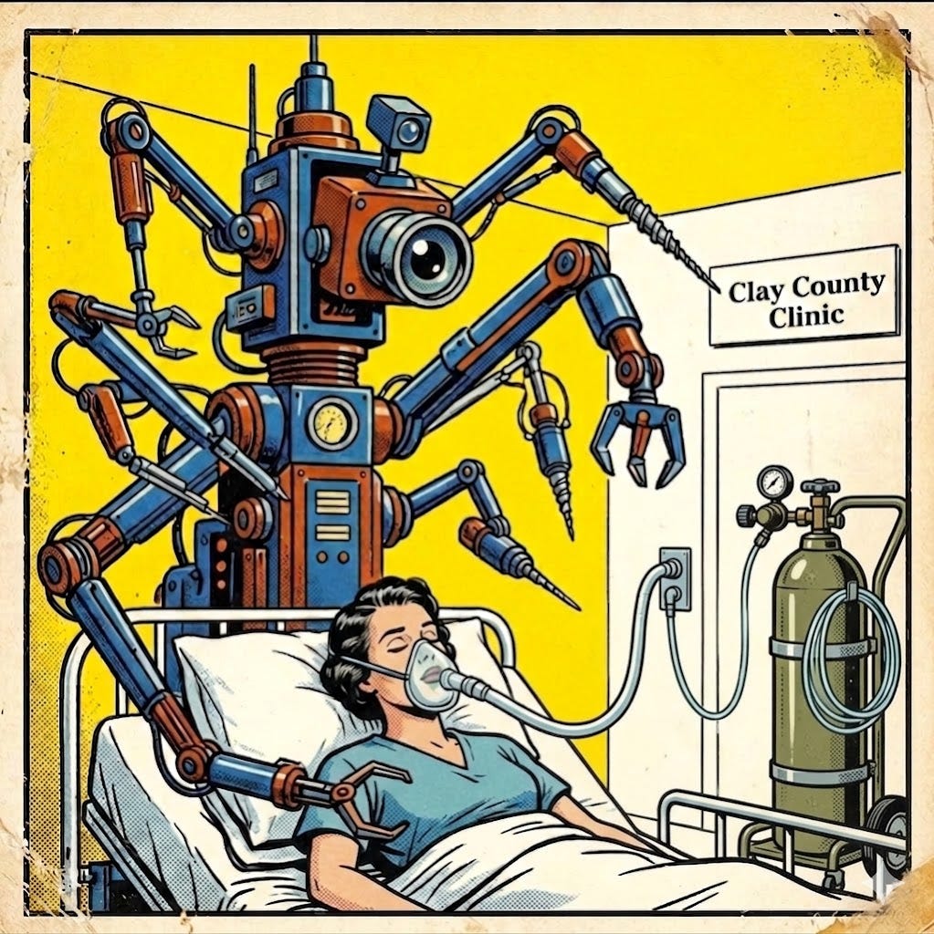 The door opened at that moment. Two nurses wheeled in a large white tower. As it unfolded, Mabel could see long arms with multiple joints extending out. At the top was a large fluorescent light and a camera. A series of surgical instruments hung from the ends of the arms like an insect with sharp spikes lining its body.