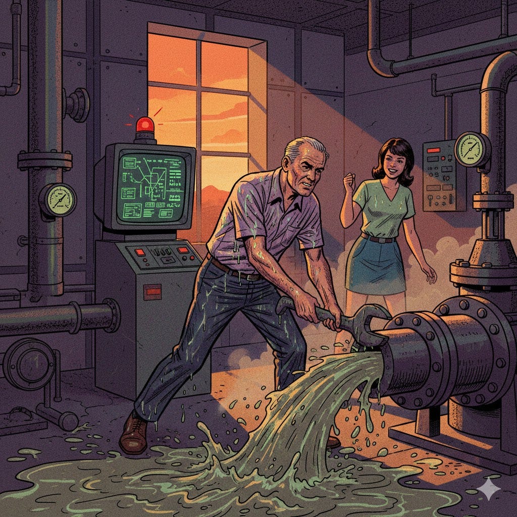 Andres threw his entire body against the wrench. The valve resisted at first, stuck in place by the intense water pressure. He let out a loud grunt and pushed again. He felt a discomforting pain inch up his back as he exerted himself harder than he had in years.