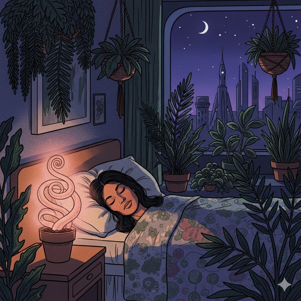 She had judged her small glowing succulent as a gimmick, but in the past week it had quietly joined her nights. The glow was soft, not like the glaring clock next to her. The glow rose and fell like it was breathing, as a living companion.